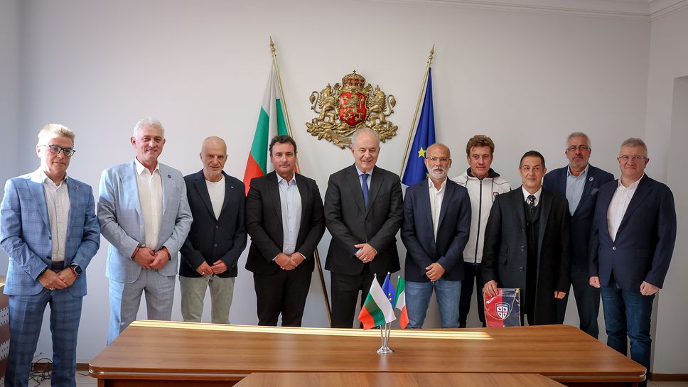 Заместник-министърът на младежта и спорта Димитър Георгиев приветства представителите на италианския футболен клуб Каляри Калчо по време на официална среща в Министерството на младежта и спорта, посветена на подписването на договор за сътрудничество между клуба, ученическия футболен клуб Ботев София и две столични училища, 57-мо спортно училище "Св. Наум Охридски" и гимназията по математика "Питагор".